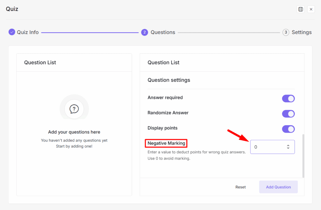 Scroll and from the questiuons settings enable answer required or not, randomize answer, display points and add negative marking.