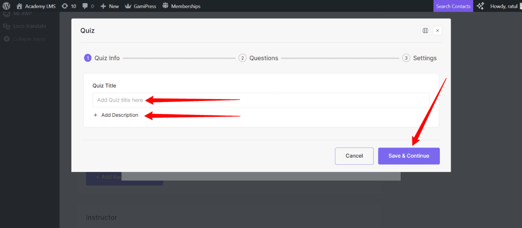To create a quiz, you have to create a course first, and after creating one, navigate to the Course Builder section and start building a course by adding a new topic.