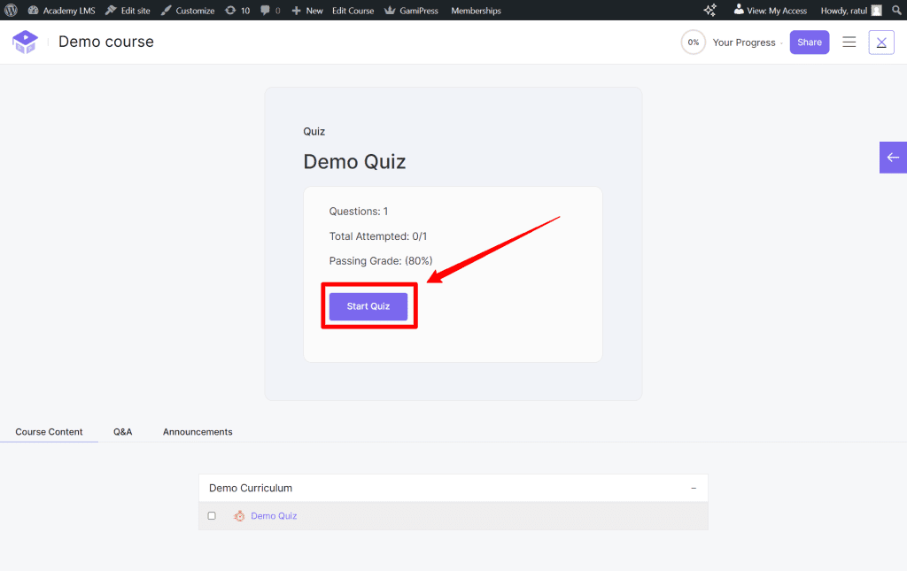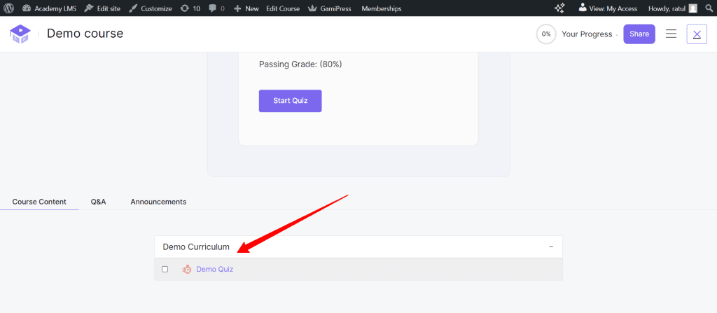 Since you’ve seen how the quiz is created via course builder and attempted the quiz, it’s time to see a different approach to creating the quiz. Go back to your eLearning site and Click Academy LMS > All Quizzes.