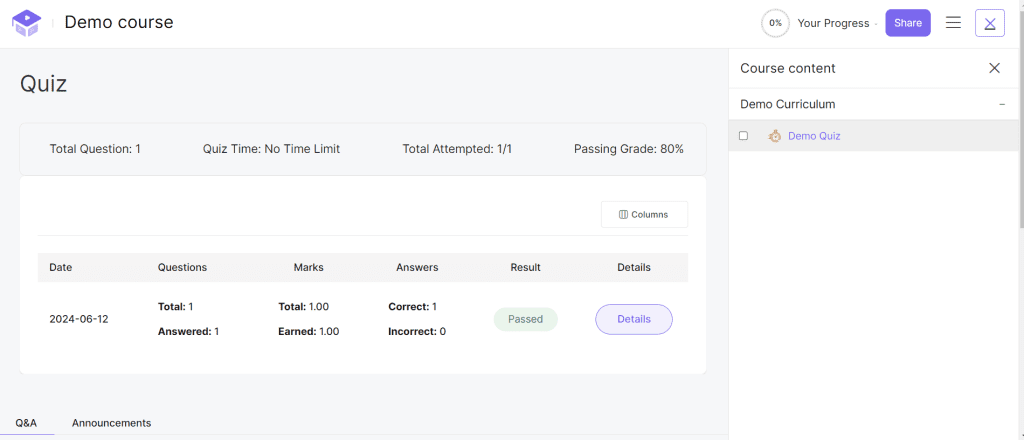After clicking the Finish button, students will be able to see the Date, Questions, Marks, Answer, Result, and Details of the quiz.