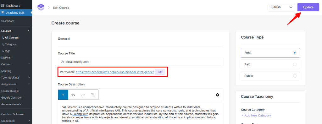 Let’s get a preview of the lessons that you’ve created. Scroll up and click on Update to save the changes you’ve made. Now click the Permalink which will redirect you to that specific course page.