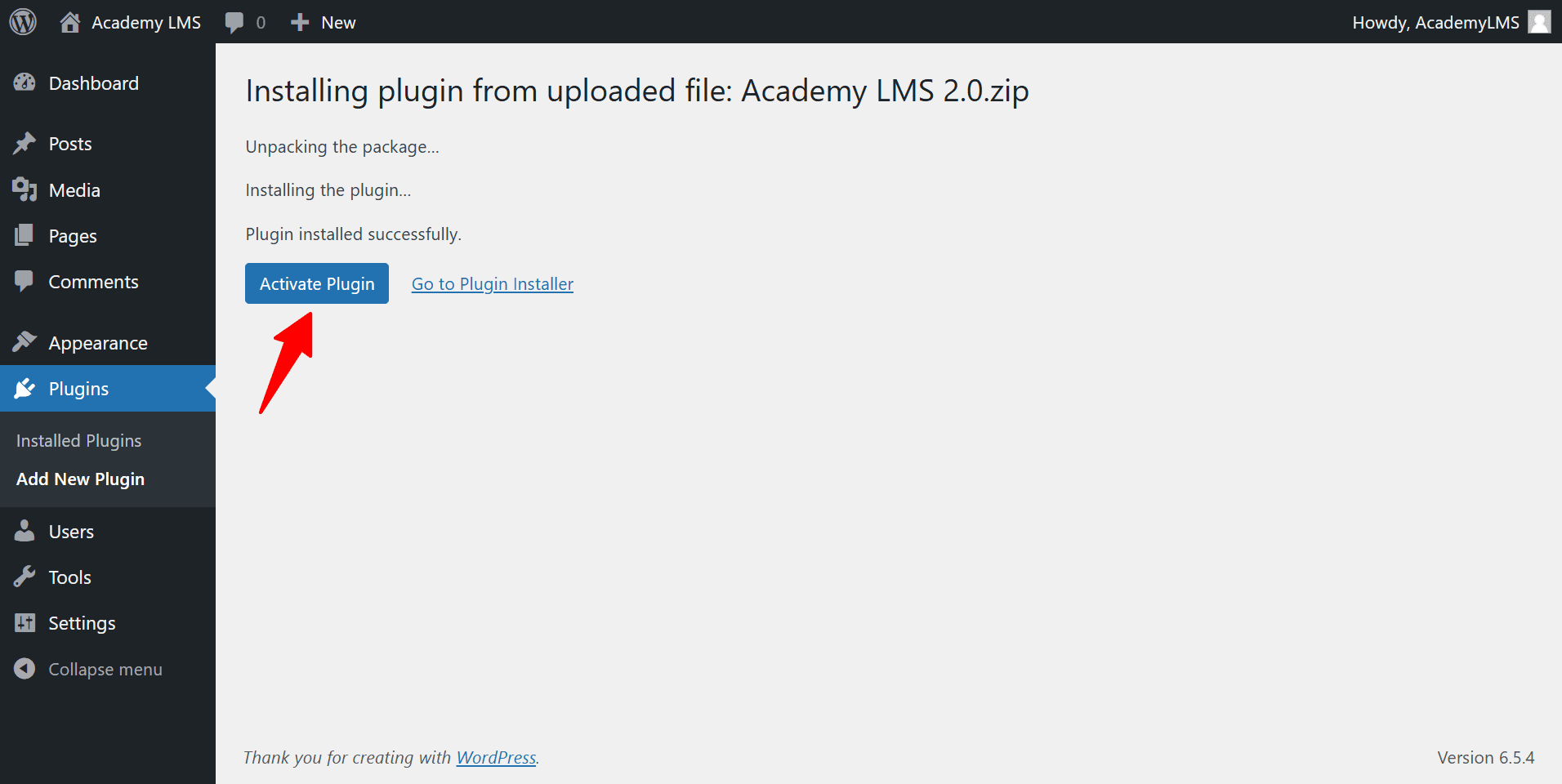 Academy LMS plugin installation is finished through the Upload Plugin option. Now you can explore and operate the plugin through your dashboard.