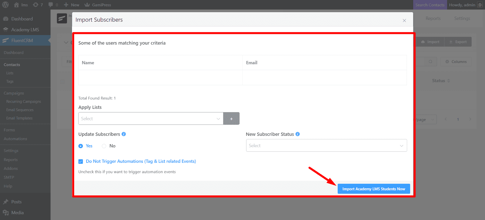 Then, you will have some data for the users, which will meet your criteria. You can create a list as well and determine “New Subscriber Status”. After that, click Import Academy LMS Students Now.