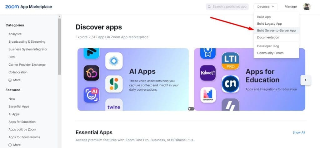 Now click on Develop section, then select and click on Build Server-to-Server App.