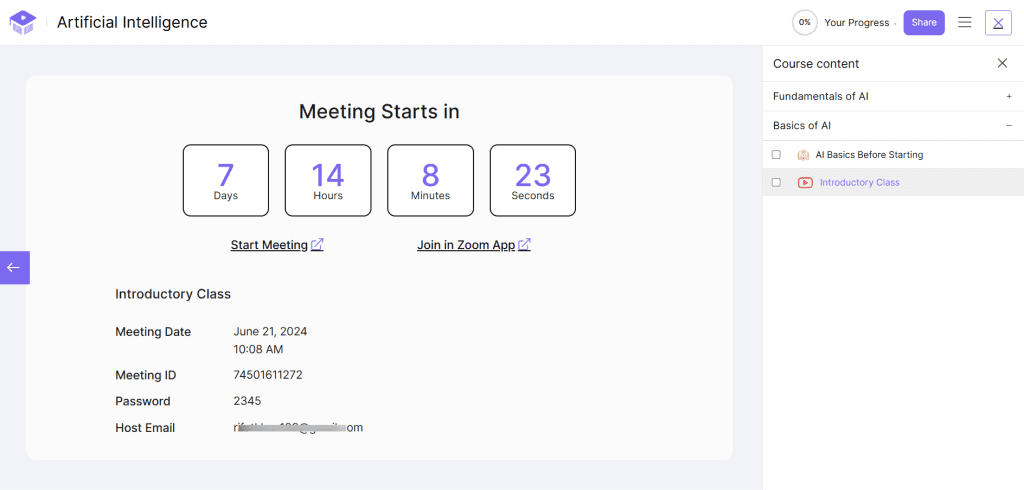 To view the meeting in your course, click on the Permalink and launch the course by clicking Start Course. You will notice that you added a meeting, which will appear as a lesson and display the meeting’s start time.