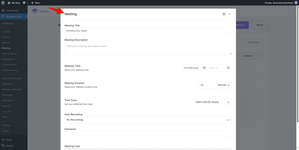 Your Academy LMS now has a Meeting menu. Click Meeting and then the Setup button to configure the Zoom integration setup.