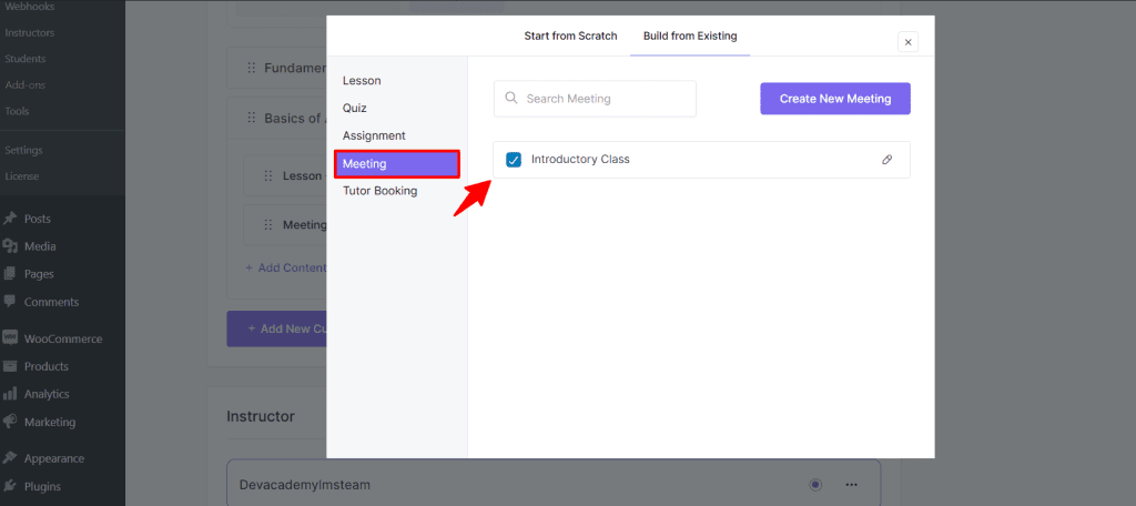 After clicking Build from Existing, select Meeting and put a tick mark on the recently created Zoom Meeting.
