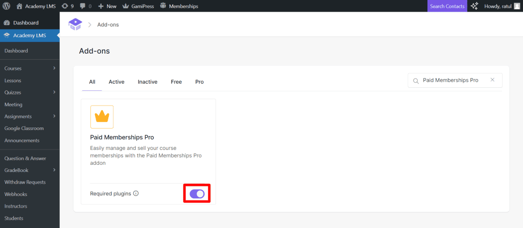 Find the Paid Memberships Pro addon by going to Academy LMS > Add-ons. Afterward, turn on the add-on by using the adjacent toggle switch.