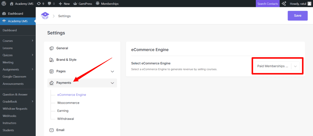 You must first allow eCommerce payments before you can establish a membership website. From Academy LMS > Settings > Payments, you can access the Payments option. Choose Paid Memberships Pro as your eCommerce Engine here, and then click the top-positioned Save Changes button.